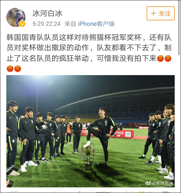 韩国队的实力高于中国队毋庸置疑,但他们随后在赛后颁奖仪式上的一系列举动,却引发了中国网友集体声讨——颁奖仪式上,韩国球员围成一圈,队员朴圭贤脚踩奖杯庆祝。