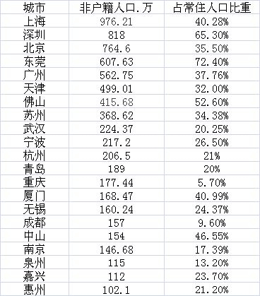 表:21个非户籍人口人口超100万的城市
