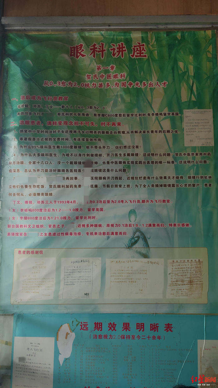 双方争论的焦点,是诊所入口左边墙上张贴的海报。题为“眼科讲座”的海报上写着,傅某、邓某、丁某等10人,治后视力从0.3变为2.0,视力恢复后分别成为文科状元、飞行员教官及留学海外等。另外还有教科文卫组织官员之子,及某领馆官员之女,治愈后满意而归。贺氏兄弟介绍,治疗手段是西医检测加中医药治疗,并现场提供了数十支没有写明成分的眼药水制剂,称是祖传秘方。