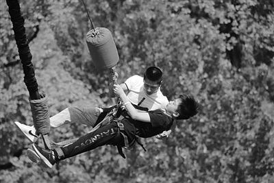 当上正式蹦极教练员后,贾江红每月拿着3000元薪水,每天的工作就是给前来蹦极的游客安装保险绳索以及教他们在空中施展漂亮的动作。