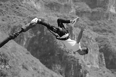 贾江红介绍,看了视频后,他就会与同事们一起试练,逐渐学会了后空翻、空中旋转等高难度动作。为了让自己动作更加流畅,贾江红刻苦训练,被绳子勒住、擦伤的情况时有发生。“记得最严重的一次,因为绳子没抓稳,绳子快速与胳膊摩擦,蹭过去后胳膊表皮被拉下一大片,火辣辣的疼,就像被火烧过一样。”