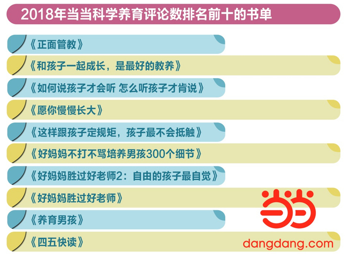 数据显示,随着越来越多“90后”升级为父母,2018年亲子家教图书销售码洋同比增长50%。家教方法、家教理论、素质教育、育儿百科和亲子关系是排名前五的科学养育类图书。
