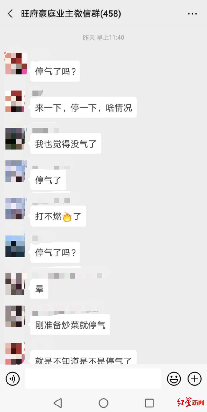 30日中午11点40分,旺府豪庭小区有住户在业主群反应停气了(图据小区业主提供)