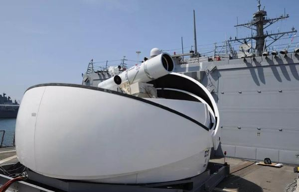 美海军于2012年先在“杜威”号驱逐舰上进行了LaWS激光器的上舰测试,图中可见安装在半卵形装置中的LwWS激光器。