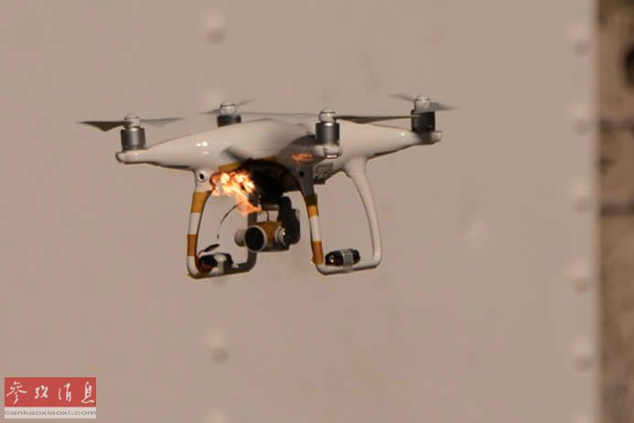 为显示激光武器的射击精度,此次测试选择的还是处于悬停运动状态的“大疆”无人机,注意图中画面,无人机右侧的机身已开始冒烟,实际已被高能激光照射。