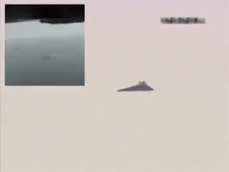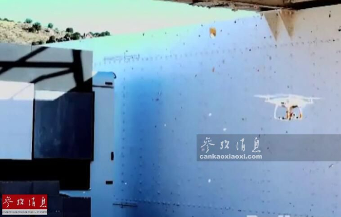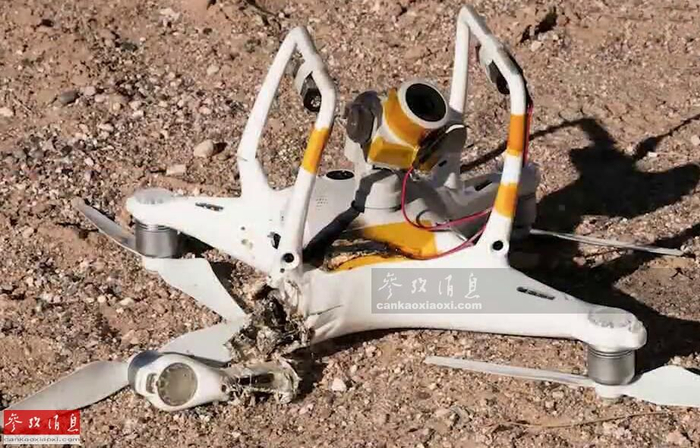另一个角度拍摄的无人机靶标画面,注意无人机右侧旋翼的蒙皮已被烧掉并冒烟。