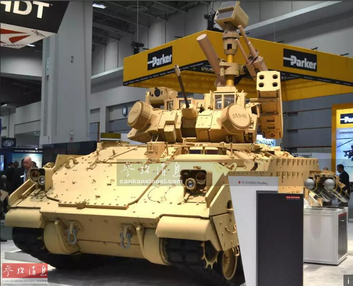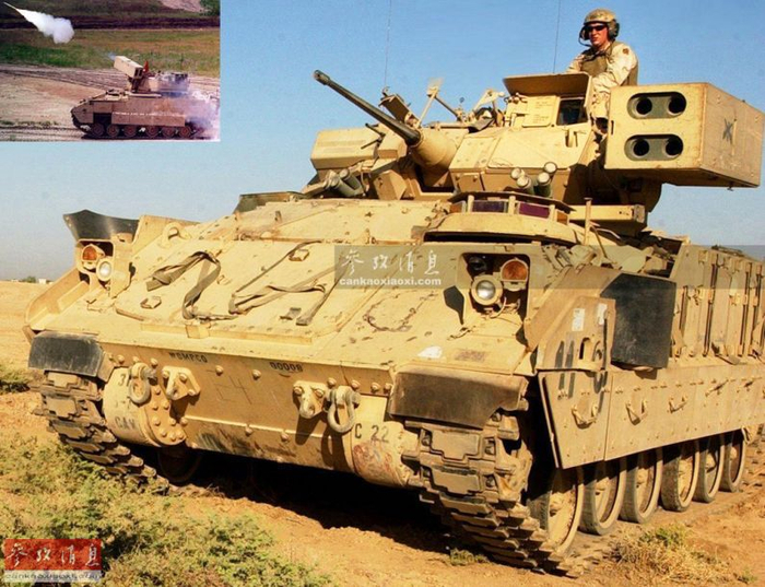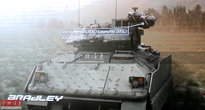 另一种轻量化改装方案是直接在现役的M2步战车上加装防空导弹发射器,无需进行专门改装,就可执行防空作战,例如图中就挂载了AIM-9X“响尾蛇”近距空空导弹的陆基版。