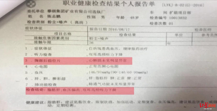 据了解,四川劳研科技有限公司是一家职业健康检查专业机构,具备从事职业健康体检资质。2016年8月22日,该公司出具了陈志鹏的检查结果报告单,其中第三项检查结果:心肺隔未见明显异常。最终检查结论:脂肪肝,血压偏高,双耳高频听力下降。