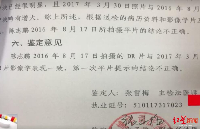 四川博宇司法鉴定所出具的鉴定报告,鉴定报告给出了明确的鉴定意见:“陈志鹏2016年8月17日在被告处拍摄的DR片与2017年3月30日在攀钢集团总医院拍摄的DR片影像学表现一致,第一次平片提示的结论不正确。”