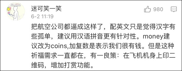 许多网友从中都感受到了机场工作人员在避免“投币祈福”事件时,不得不将计就计顺着某些乘客思路进行宣传的无奈。