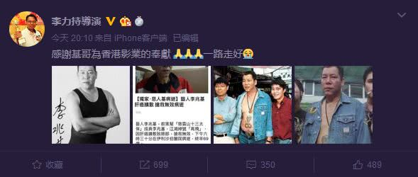 香港导演李力持2日在微博发文,确认演员李兆基去世的消息。据悉,其妻子一直守候在身边,陪他走完最后一程。