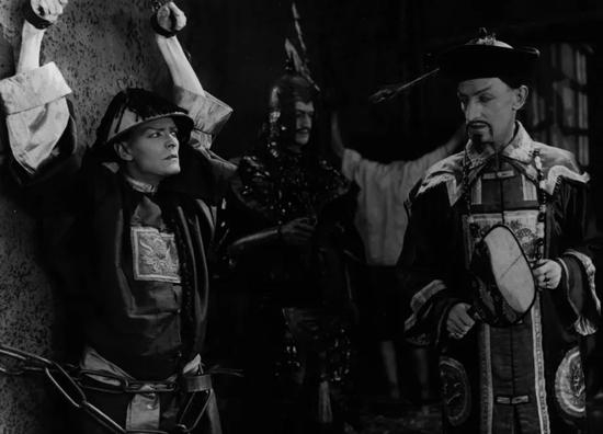 ▲193 0年代,英国电影中的阿拉丁(持扇者),身着清朝官服,形象颇似傅满洲。图片来自:Hulton Archive/Getty Images。