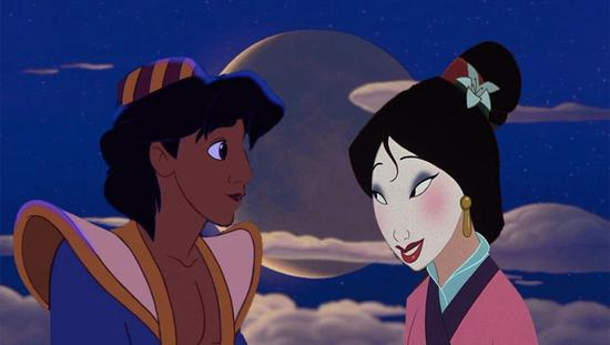 ▲同为迪士尼经典动画,阿拉丁和花木兰相比,只不过肤色深了一点,很像一对中国情侣。图片来自:Disneyclips。