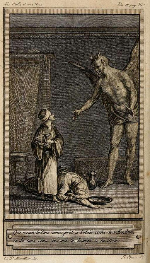 ▲1785年,法国插画师克莱门·皮埃尔·马里莱尔(Clément-Pierre Marillier)绘制的阿拉丁与灯神。灯神兼具恶魔的犄角与天使的翅膀,还有一个中国小辫子。图片来自:Wikimedia Commons。