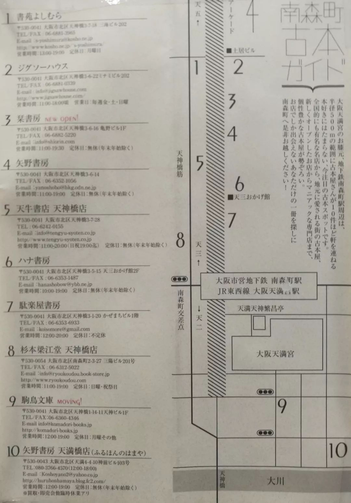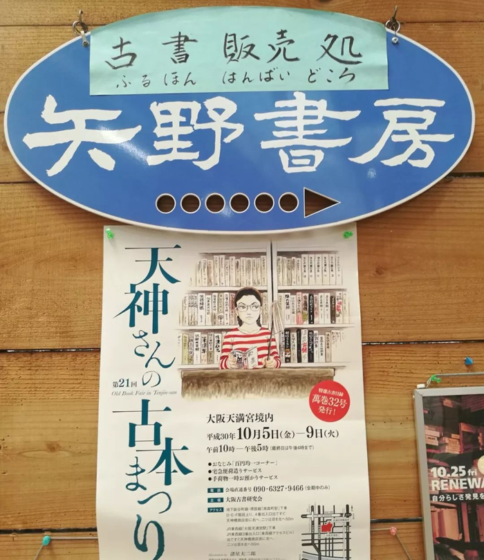 沿街朝天神宫方向走,不多远又遇一家书店,叫栞书房。进门看见书架上贴着一张:南森町古本地图,真是太开心了,原来这一片是南森町书店群,在地图上数了数,共有十家书店。这一发现真是太意外了,哪想到简单逛逛书店,却乱入一条书店街。我于是加快脚步,希望能在有限时间内逛完这些古本店。栞书房也有非常多漫画书和艺术画册,匆匆买了一本安野光雅画册。