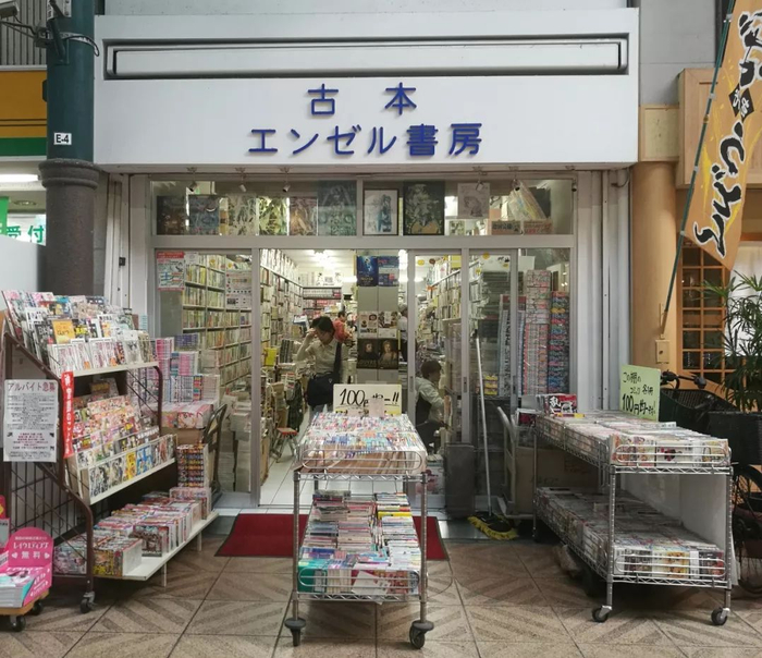 儿童乐园对面有一条繁华的商业街,中午吃饭的时候瞥见一家书店,就先去这家逛逛。这家古本エンゼル书房以日本漫画为主,店内少数几个书架也有人文社科书,细看有不少好书。刚开始逛,不敢冒然买书,怕负重影响接下来逛店,选了一本薄册子《日本史年表·地图》,吉川弘文馆出版,很便宜,只200日元。后来听作家刘柠兄说,这本小册子很不错,也是他常用的工具书之一。还买了一本《浮世绘·地图》。