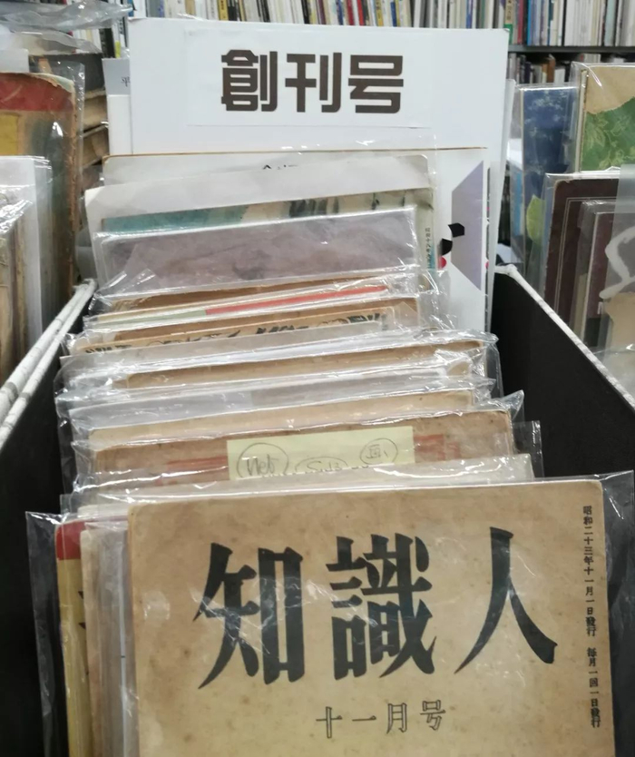 接下来几乎一家挨着一家。下一家是矢野书房,在门口的特价书架上,有一架100日元过刊,都特别好,我分别挑了其中各一期,《本の杂志》、《一册の本》等。矢野书房里有特别多关于书的书和杂志,全是我的爱啊我的爱。店内还贴了好几张古本书展的海报,还有很多很多《书物展望》,买了其中一期。