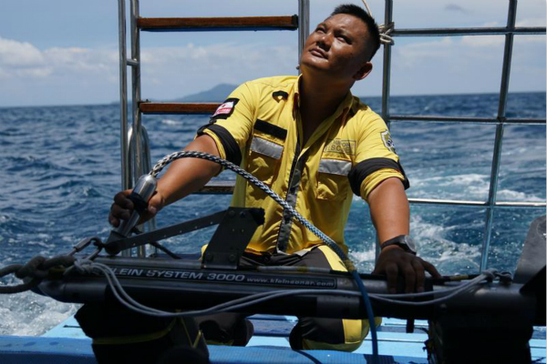 图说:泰国普吉岛沉船救捞,公羊救援队队员正在进行声呐探测。