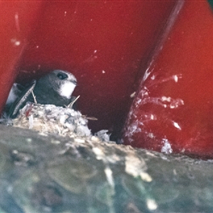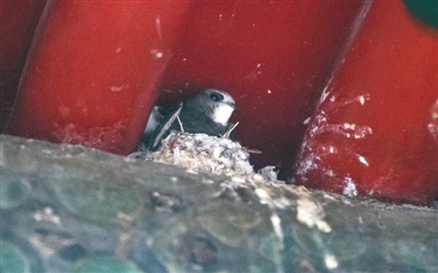 4月17日傍晚,在北海五龙亭阴暗的木结构缝隙中安家的雨燕探出了头
