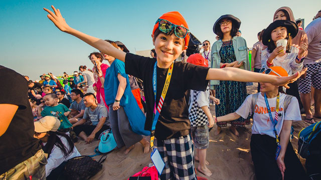 阿那亚黄金海岸边,草莓籽舞台上灯光绚烂。孩子们或埋头挖沙,或欢闹奔跑,有的跟着父母坐在舞台下听音乐摇摆,更多的孩子钻进沙滩散落着的大帐篷里,参加词曲创作工坊、童谣工坊、声音实验室或是踢踏舞工坊活动。夕阳西下,几只巨型恐龙人偶出现在音乐派对上,黄色大气球从天而降,大人和孩子合力拉起一块彩色篷布,将气球一次次推向天空,欢快尖叫声响彻夜空。