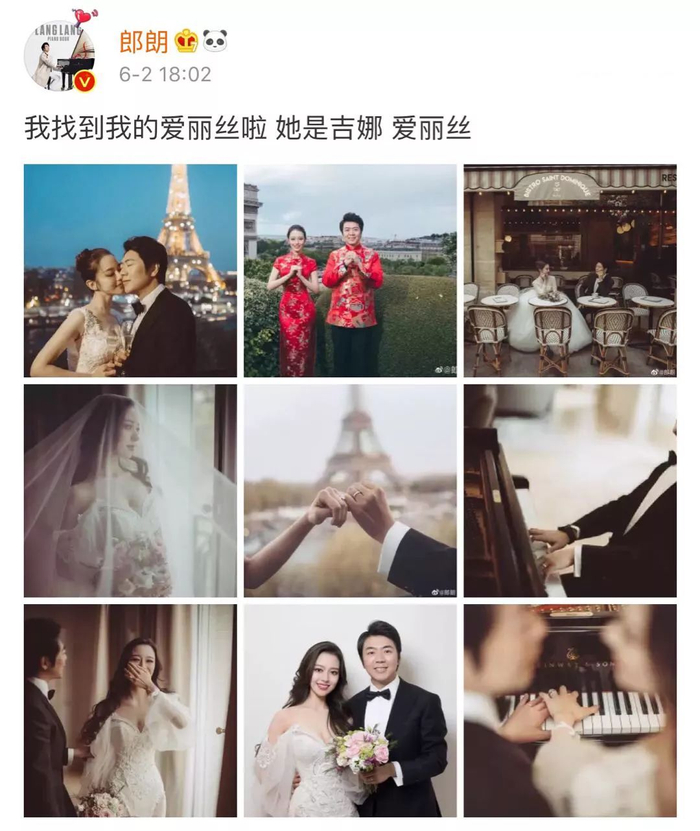 6月2日下午6点02分,享誉国际的钢琴家郎朗更新了微博,晒出幸福的九宫格。写道:我找到我的爱丽丝啦,她是吉娜.爱丽丝。宣布自己结婚。在短短两个小时内,社交媒体的阅读量就突破2.4亿次,足见郎朗的人气之高。