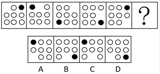 解析:看点的移动规律,黑点在图形外周每次按逆时针方向平移2个单位,空白部分每次在外周按顺时针平移1个单位,答案选 C。