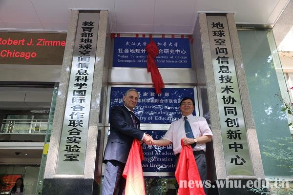 在测绘遥感信息工程国家重点实验,司马博与龚健雅共同为“武汉大学-芝加哥大学社会地理计算联合研究中心”揭牌。作为该中心合作推进成果,年内芝加哥大学的地理计算软件将集成到国内外多方合作的地理信息软件大平台里。他还饶有兴趣地观摩“珞珈一号”01星模型,了解新丝绸之路上的智能空间信息、室内导航定位等科研成果。
