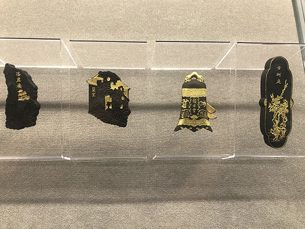 本次展览中,最为引人注目的是一套40锭的御园图集锦墨。御园图系选自故宫、西苑、圆明园三处的40景。40锭墨构思巧妙、形态各异、工艺精巧,或形似古琴、钟鼎,正面书写楼阁景观名称,背面绘制亭台全景,侧面阳文“乾隆甲子年”,“曹素功谨制”,这套集锦墨品数之多、雕刻之精,为制墨史上所少见。