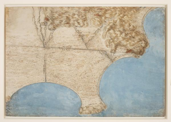 这幅地图不但美轮美奂而且颇为前卫。达·芬奇先极尽所能收集了相关地理知识,然后便展开了天马行空的想象。他想象着托斯卡纳海岸线依靠着弧形的海湾,像一块蓝色的地毯与河岸相接得天衣无缝。因为包含了绵延的山脉,这幅由水彩和粉笔绘制的图画既是地图也能算是浮雕。不过它最主要还是画家的一种憧憬,一种对鸟儿从高空中向下俯瞰式的想象。 达·芬奇,《彭甸沼泽地图》,约1514-1515年