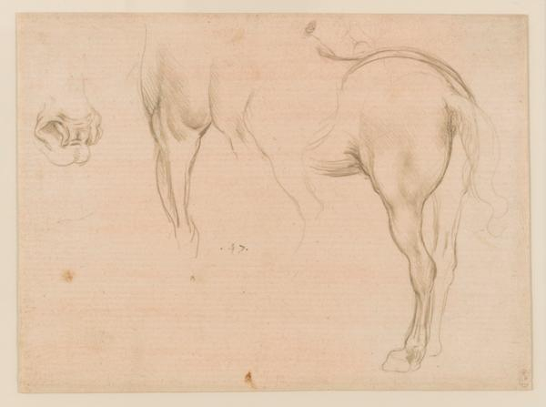 盘在少女头颅上的玉米形编发在像流水般自由散开垂落前是何种模样?一匹马在低头啃食青草的时候下颚是怎样活动的?达·芬奇从前从后从左从右,甚至从马的背部透过其四肢观察其嘴部的活动,以获得一个对马咀嚼时牙齿的360度的认识。 达·芬奇,《马的学习》,约1490年