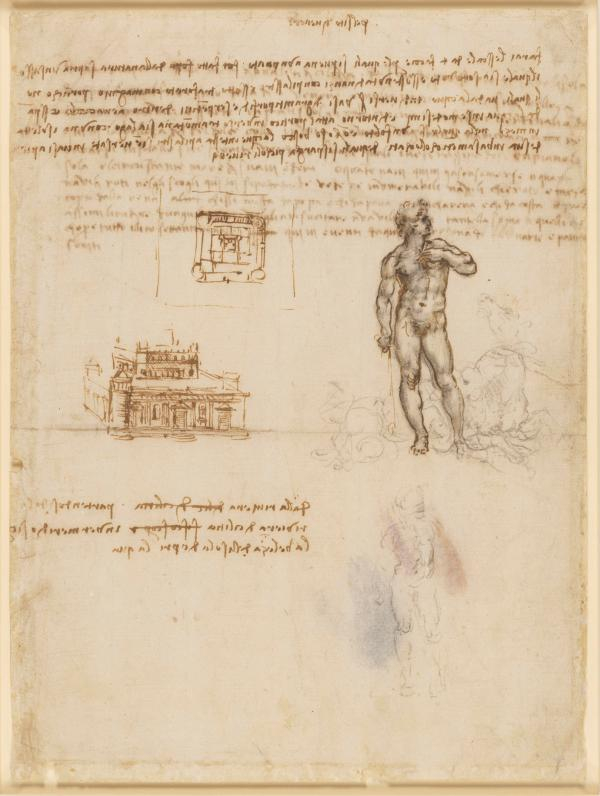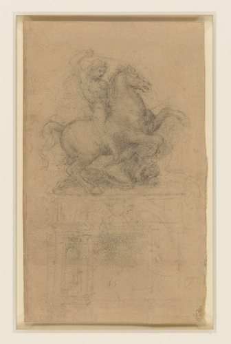 莱昂纳多的另一件丢失的作品——由弗朗西斯科·斯福尔扎的儿子为他在十五世纪八十年代委托的骑马纪念碑——在其工艺的优雅,精确和严谨方面无人能比。正如这幅作品一旁的标示上说道,达·芬奇越是画这匹马,就越少关注骑在马上的人(无论如何已经死了),直到他完全忘记了弗朗西斯科的存在。 达·芬奇,《为骑马纪念碑而作》,约1517-1518年