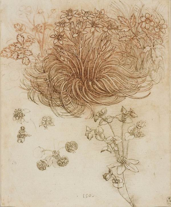 此次画展中最早的马创作于1480年,似乎表达了达·芬奇观察和思考的方式。这幅素描以一种吸引人的,甚至是略带幽默的方式刻画了它的主人公有些粗糙的马蹄和不起眼的耳朵。虽然它不足以让人从赛马阵容中选出它,但它仍然有一些独特之处。莱昂纳多用直线覆盖马的身躯,以标出其身体的相对比例。虽然他观察的是特定的马,但他希望从中推断出一种普遍的比例。展品安排上这一点被更加突出。虽然展品是按主题分组但仍然大致按时间顺序进行排列。 达·芬奇,《伯利恒、木海葵和大戟螺旋花蕾》,约1505-1510年