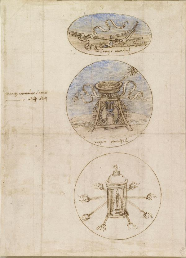 就像树从一颗种子中生根发芽一样,这幅油画源自于素描。这颗种子包含了达·芬奇的所有知识:他的观察,他的审视,他对世界及其所有奇观的深入探究,从生命的起源到夜晚的黑暗,在他后期的作品中一一展现。面对这位天才,我们最大的希望莫过于让他画出一切了。 达·芬奇,《工程设计图》,1506-1510年