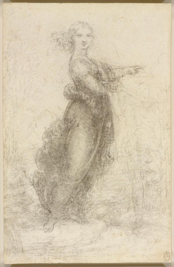 有一幅作品展示了一位女子的头部和肩部在旋转中的一系列状态。女子优雅地扭动和转动,其身体的各个角度,甚至是后部,都通过金属点绘制在粉红色的抛光的画纸上。达·芬奇的线条引人注目,无论是进是出,还是通过一系列运动中的状态。这幅作品是一位芭蕾表演者一整套舞蹈动作的静态图像呈现。在所有这些变化中可以依稀看到莱昂纳多另一幅风格怪异的肖像画《抱银鼠的女子》中模特切奇利娅·加莱拉尼的身姿扭曲的模样。 达·芬奇,《风景中的女子》,约1517-1518年