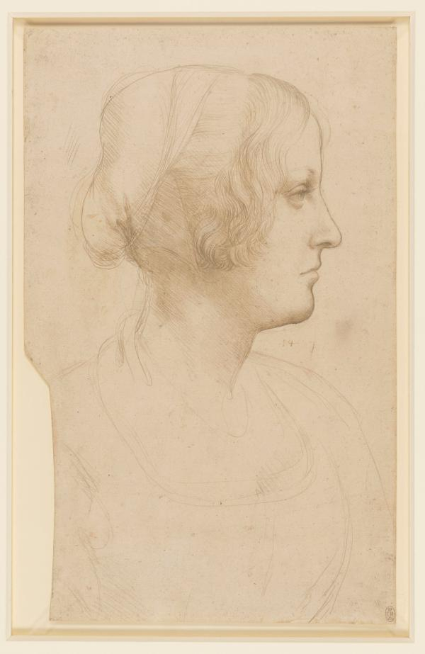 比起达·芬奇的油画更喜欢他的素描并算不上有争议性;很多人都是这样。但这次画展同样让我们记住了那些莱昂纳多的油画。一幅《最后的晚餐》的大开面复制品完美地挂在画廊的一面墙上。它的下方是使徒的素描画,有年轻和老长者裙褶和手部。甚至在一幅水墨素描中,艺术家尝试着各种不同方式将13个人物布局在画面中桌子的一侧——每个人都是动态的,每个人都等比例呈现。 达·芬奇,《一位年轻女子的肖像》,约1490年