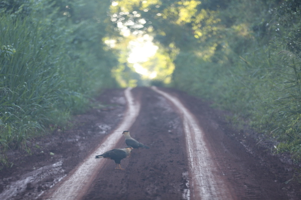 从伊瓜苏港到今天的目的地有两个多小时车程,我们没有选择直达的捷径,而是先沿12号公路向南,再经过19号公路向东,这样一路有更多的时间停下观鸟。走了半个多小时第一次停车,我就发现了新品种,远远看到一只小䴕雀(Lesser woodcreeper),它用长嘴在树干上颇有耐心地敲打试探,边寻找食物边往上走。很长时间没离开这棵树,因为太远看不清捕食细节,我们只能通过猜测判断它的收获不错。这边小䴕雀还没有离开的意思,身后一片叽叽喳喳声由远而近。那是另一边高压线塔上几只大食蝇霸鹟(Great kiskadee)发出来的,这种鸟体型不大,但却是荤素不忌、凶悍捕食的小猛禽。这种鸟在阿根廷很常见,几乎从南到北一路看到,我们没花什么时间在它们身上,又走一阵,找到一处开阔地方再次停下,打算在这里多停留一阵子。