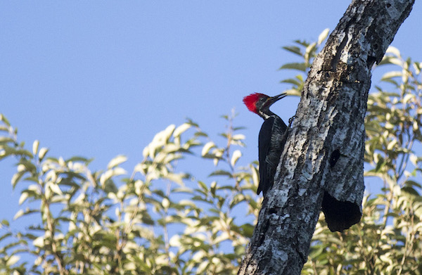 我跟着它一起上到卧室上层的开放平台。这个不大的方形空间居高临下,是整片丛林里视野最好的地方,周围的树冠层、远处的山一览无余。我们上来时,两只红色头冠黑色身子,腹部分布黑白条纹的斑纹啄木鸟(Lineated woodpecker)已经在不远的树枝上有一阵子了。