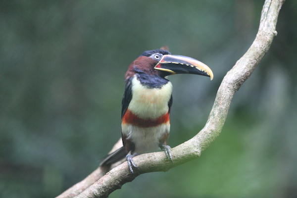 食物的大丰收当然也是鸟类喜欢的。一位酒店帮工跑到我跟前说了一通西班牙语,像在陈述一件很紧急的事,见我听不懂,改用单词:“Toucan,toucan……”然后指着庭院的另一个方向。我一下明白了,她说的是大嘴鸟,一种模样特别,只在南美热带地区才能看到的鸟。我赶紧抄起望远镜快步跟着她。顺其手指方向看去,我在一处不高的牛油果树枝上发现一只红胸大嘴鸟(Red-brested toucan),扫一下周围的树冠,又在一个隐蔽的粗枝上看到了另一只雄鸟。等了一会后,雄鸟蹦了两下,在一个没遮挡的树枝上一转身,露出了正脸,眼睛和我的望远镜对视,胸部鲜艳的一条红色也被一览无余。它似乎并不怕人,张开嘴发出低沉的叫声,露出可爱的天然呆表情,神态让我想起《孤独美食家》里五郎大叔每次饿了的样子。