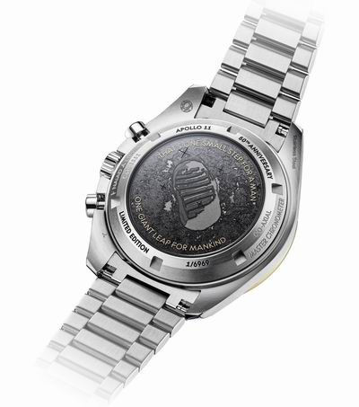 表背中央呈现黑色的月球表面形态,并以激光雕刻出宇航员留在月球表面上的脚印图案。尼尔·阿姆斯特朗的传奇经典名言:“THAT’S ONE SMALL STEP FOR A MAN,ONE GIANT LEAP FOR MANKIND”(这是个人的一小步,却是人类的一大步),同样被刻于表背之上。