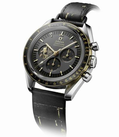 灰色表盘与黑色分钟圈形成特别的色调对比。中央计时秒针覆以Moonshine 18K金PVD涂层,其他指针、倒角式小时刻度及复古欧米茄品牌标识均采用Moonshine 18K金制成。表盘11点钟位置镶贴Moonshine 18K金制成的“11”数字小时刻度,以致敬阿波罗11号任务。更特别的是,9点钟位置的 Moonshine 18K金小表盘,以黑化处理和激光雕刻技术呈现出巴兹·奥尔德林即将踏上月球的图案。