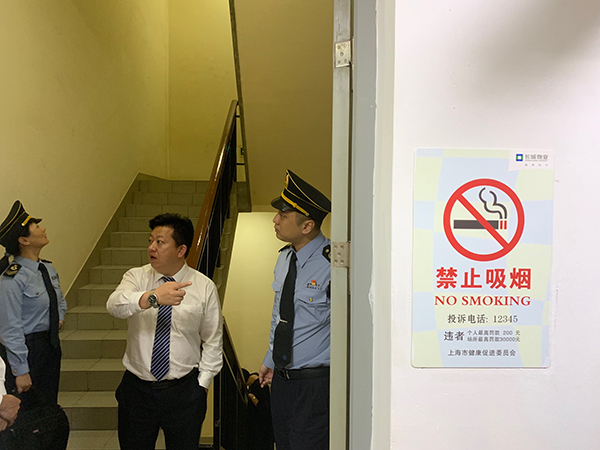 执法人员检查上海绿地中心商务楼宇消防通道内的禁烟标识。