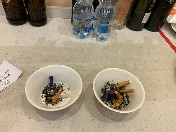 晚上6时正是就餐高峰,执法人员在顺风大酒店825包房内检查发现,整个房间内充满了烟味,饭桌上顾客放置了香烟,3个小碗内堆满了烟蒂。而在晚上7时左右,执法人员在新南华酒店202包房内同样发现有违法吸烟现象。