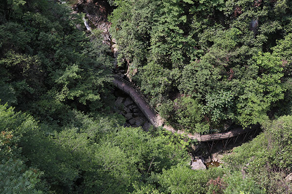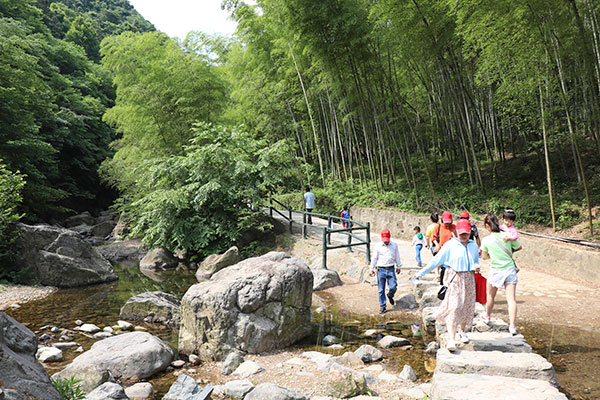 初入景区,漫步于景观步道之上,醉心于茂林修竹之间,水车、石屋、大坝、瀑布生动呈现着一步一景,涓涓溪流从身边流过,瀑布潭水飞流直下。步道有一段是沿着山体峭壁凿出来的,高低不规则的石阶既增添了野趣,也让人觉得惊险刺激。