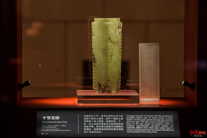 这件十节玉琮的玉质和金沙其它玉器的玉质相比有显著的差别,在上海、苏州、嘉兴等地区出土的良渚文化玉器则可以见到有青绿色或湖绿色的。所以,无论从材质、形制、工艺还是纹饰方面进行分析,金沙遗址出土的这件十节玉琮都具有十分浓厚的良渚文化风格,是一件典型的良渚文化晚期的玉琮,也是一件名副其实的“进口产品”。