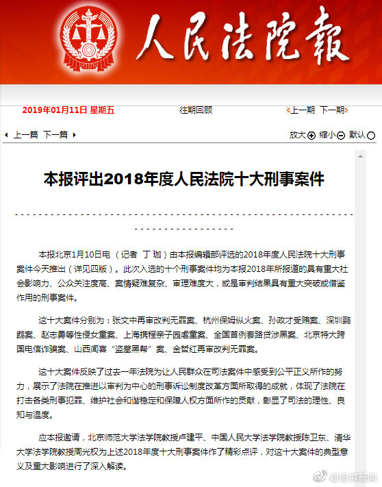 人民法院报报道显示,这十大案件反映了2018年法院为让人民群众在司法案件中感受到公平正义所作的努力,展示了法院在推进以审判为中心的刑事诉讼制度改革方面所取得的成就,体现了法院在打击各类刑事犯罪、维护社会和谐稳定和保障人权方面所作的贡献,彰显了司法的理性、良知与温度。