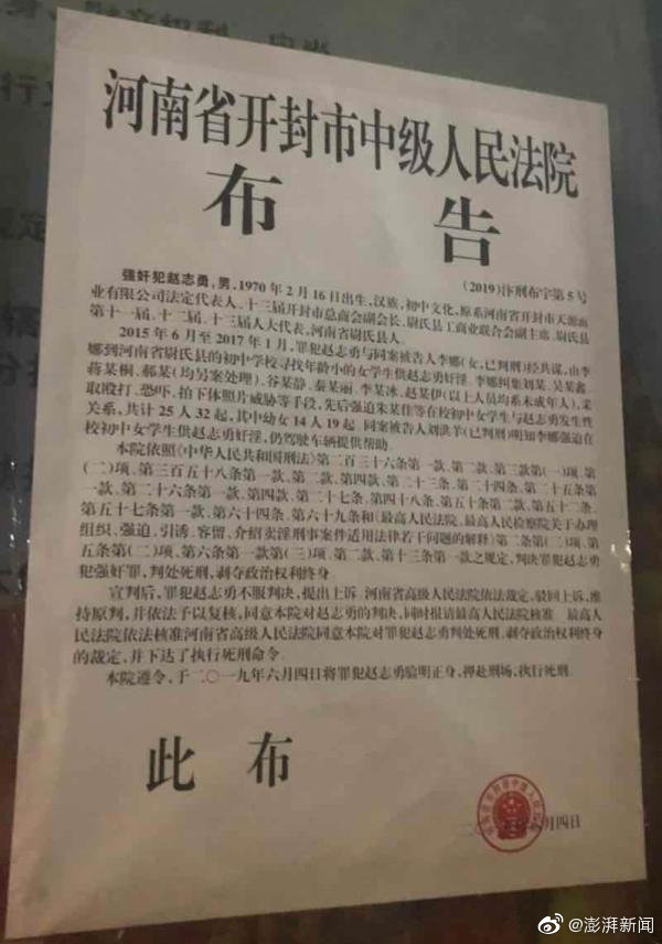 6月4日,河南省开封市中级人民法院在门外布告栏张贴(2019)汴刑布字第5号布告,称赵志勇、李娜等强奸、组织、强迫卖淫、协助组织卖淫一案罪犯赵志勇已于当日验明正身,押赴刑场,执行死刑。