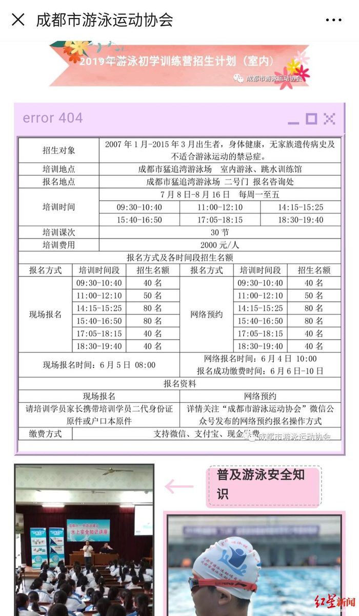 “女儿今年7岁。”为了让女儿锻炼身体,父母也住在游泳场附近,她就想让女儿在猛追湾游泳场学游泳,“价格也不贵”。韩女士告诉记者,早在去年,她就得到了朋友善意的提醒:“朋友说,猛追湾游泳场的暑期培训很火爆,有通宵排队的。”她当时便关注了发布招生信息的微信公众号“成都市游泳运动协会”。