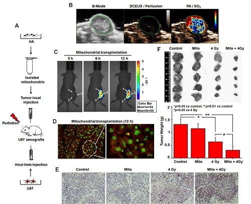 移植进入肿瘤细胞的正常功能性线粒体,能够有效地分裂、增殖,稳定存活下来,并逐渐引起肿瘤细胞内与三羧酸循环有关的基因高效表达、抑制瓦博格效用,驱使肿瘤细胞的能量代谢表型由有氧糖酵解向氧化磷酸化方向转变。功能性线粒体移植还能够增强辐射诱导的线粒体凋亡通路活化、加剧肿瘤细胞死亡、抑制裸鼠体内实体瘤的恶性增长。体内外实验均发现线粒体移植对人神经胶质瘤具有较好的辐射增敏作用(图2)。