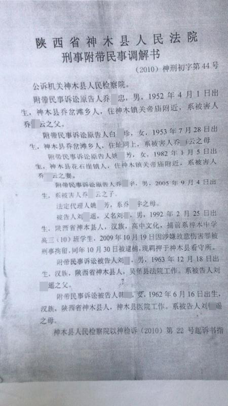 据家属提供的一份《刑事附带民事调解书》显示,刘某遥父亲刘勇彼时正在陕西吴堡县法院工作。该《刑事附带民事调解书》还显示,“刘某遥生于1992年2月”,案发时未满18周岁,与警方当年向媒体通报的“18岁”并不相同。