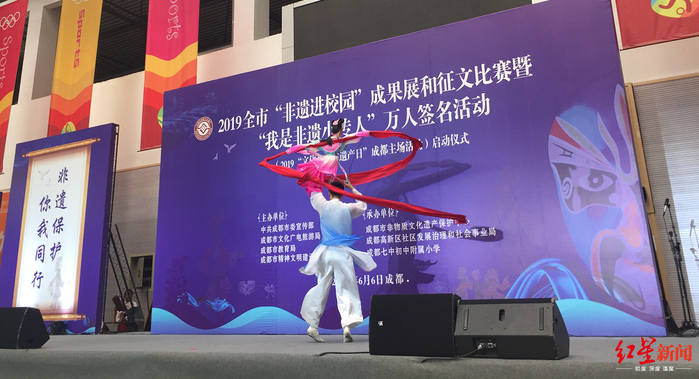 6月6日,一场“非遗进校园”教学成果展和征文比赛暨“我是非遗小传人”万人签名活动在成都七中初中附属小学举办。学校领导和教师代表、“非遗进校园”传承人授课代表、学生代表等共计1000余人齐聚一堂,通过启动仪式、传统表演艺术教学成果展演、传统技艺教学成果展示、授课传承人技艺展示、范文展示五大活动,集中展示“非遗进校园”教学成果、切磋交流“非遗进校园”教学经验。
